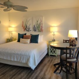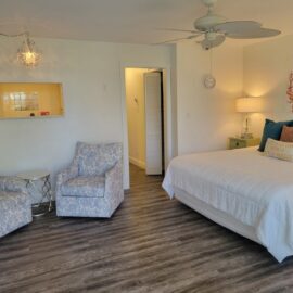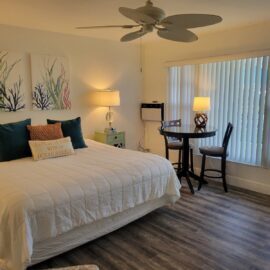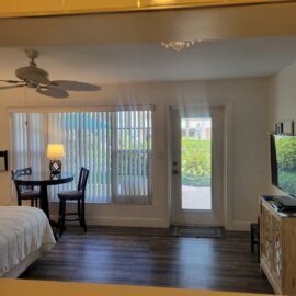 This Garden-Side Studio is quite cozy, with all the amenities. It offers a private patio with a partial ocean view, a table and chairs overlooking the the garden. It's fully furnished with a king size bed, a small kitchen with all your cooking and eating utensils, a stove with oven, coffee pot, toaster, microwave and apt size fridge. It also offers a small dining area, a bathroom with walk-in shower and plenty of towels, a flat screen TVs, a walk-in closet with a safe, a hair dryer, an iron with ironing board, complimentary coffee and tea. Also included at no extra cost; High-Speed Wi-Fi Internet, off-street parking, beach towels, beach chairs and umbrellas.